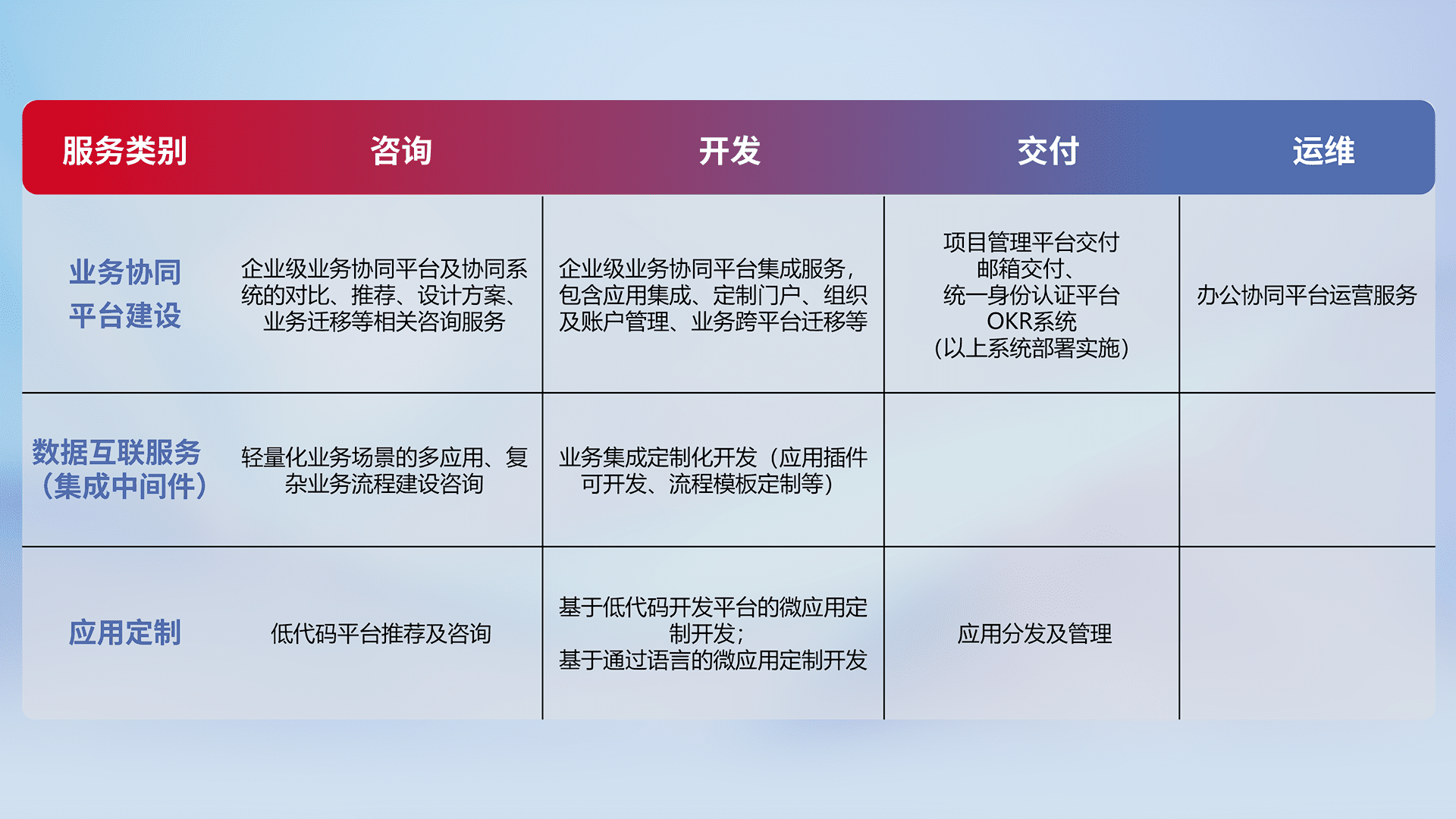 针对钉钉、、企微、、IDaas等平台级产品提供产品的规划、、、方案、、、、交付、、定制化开发等服务,,实现如统一协同办公、、、智能客户服务、、、混合会议管理、、、智能数据查询、、、等业务场景,,,,实现数字化转型。。。