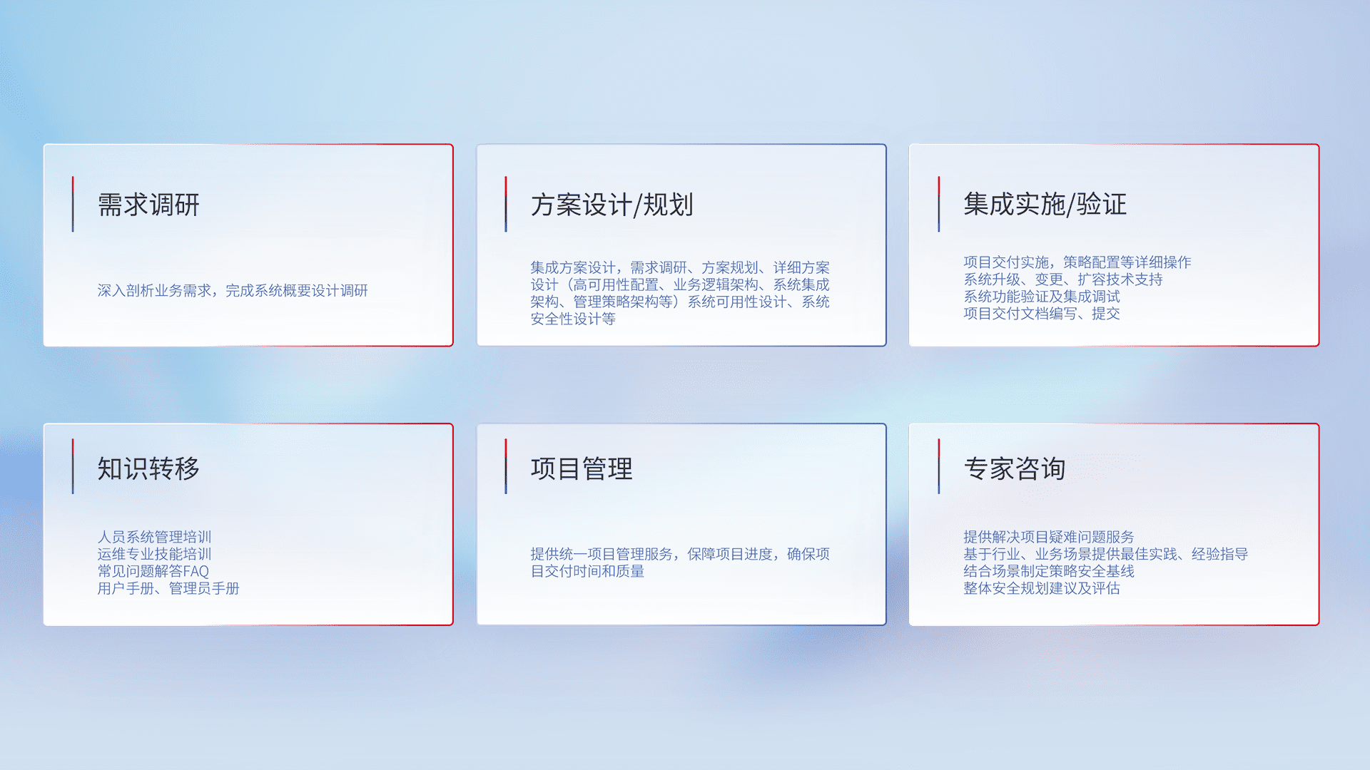 针对客户行业特性,,,,将宏观的安全战略和需求,,,通过专业的交付服务,,实现项目落地,,为客户提供标准规范的集成交付服务。。。。